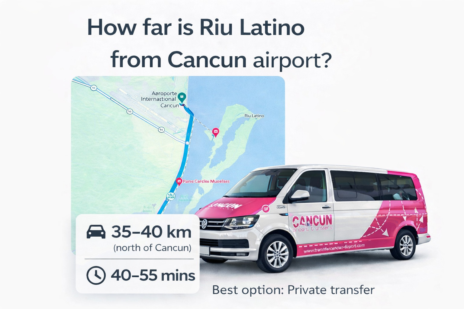 Riu Latino Costa Mujeres se encuentra a 35–40 km del Aeropuerto de Cancún. Conoce la distancia exacta, el tiempo de traslado y las mejores opciones de transporte privado para llegar cómodo y sin est