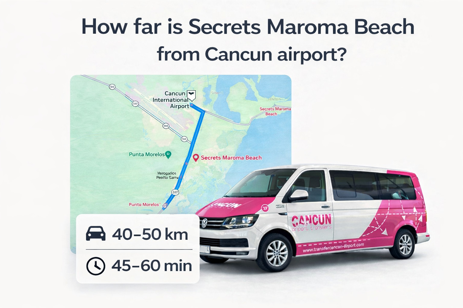 Secrets Maroma Beach se ubica a aproximadamente 40–50 km del Aeropuerto Internacional de Cancún (CUN). El traslado dura entre 45 y 60 minutos, y la opción más cómoda, segura y recomendada es un traslado privado reservado con anticipación.