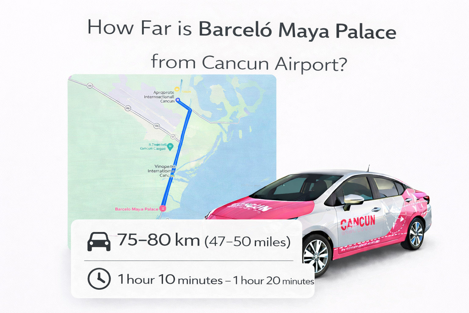 Barceló Maya Palace se encuentra a aproximadamente 95–105 km del Aeropuerto de Cancún. El traslado dura entre 1 hora 30 y 1 hora 45 minutos. Descubre la mejor ruta y por qué el transporte privado es la opción más cómoda y segura para llegar a este resort todo incluido en la Riviera Maya.